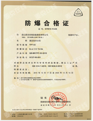 此次防爆證的取得充分表明了麥克在線自主研發的防爆在線連續分析儀、溫壓流變送器、防爆電加熱器研發水平在國內的領先性,我公司也將繼續秉承“創新、務實”的企業精神,進一步全方位提升產品開發能力和質量水平。
